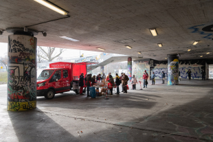 Ca. 30 ehrenamtliche Mitarbeiter unterschiedlichster Herkunft und mit verschiedenen Lebenshintergründen kümmern sich bei der Essen-Ausgabe liebevoll um die Bedürftigen. Es werden pro Einsatz 120 – 150 Essen ausgegeben.