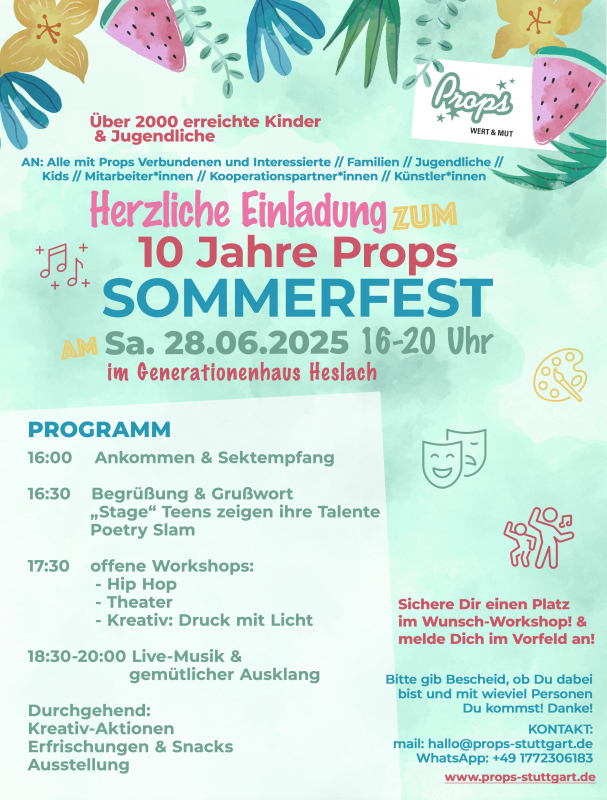 „Props Together e.V.“ feiert am 28. Juni 2025 sein 10-jähriges Bestehen. Bei Kunst, Kultur, Theater und vielem mehr, haben sich über 2000 Kinder und Jugendliche beteiligt. Die Kinder und Jugendlichen konnten bei diesen vielen Angeboten Ihr Können und Ihre Talente präsentieren und ausbauen sowie ihr Selbstbewusstsein stärken.