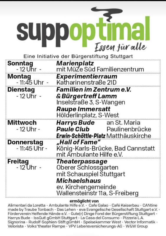 Die Bürgerstiftung der Stadt Stuttgart hat mit der Aktion Supp Optimal die Möglichkeit geschaffen, von November 2020 bis April 2021 Speisen an zentralen Orten der Stadt Stuttgart an Bedürftige zu verteilen.